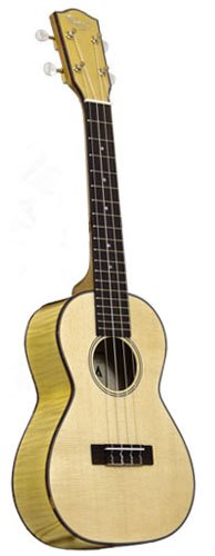 SOLID SPRUCE TOP WITH FLAMED MAPLE BACK AND SIDES gives this uke a distinctive voice and appearance. Faux tortoise shell binding, 19 fret rosewood fingerboard and a rosewood bridge, bone nut and saddle, deluxe geared tuners, glossy finish and Aquila strings. Very good yet affordable instrument. Bright, loud and articulate uke.